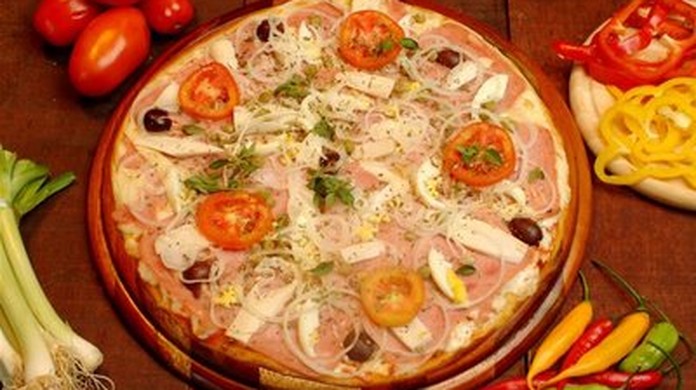 Molho de tomate, mussarela, presunto, calabresa, azeitonas, ovos e cebola.