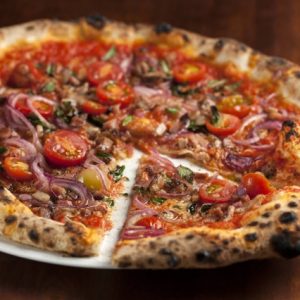 Molho de tomate, champignon, temperada com aliche, salsinha, cebola, coberta com mussarela e azeitonas.